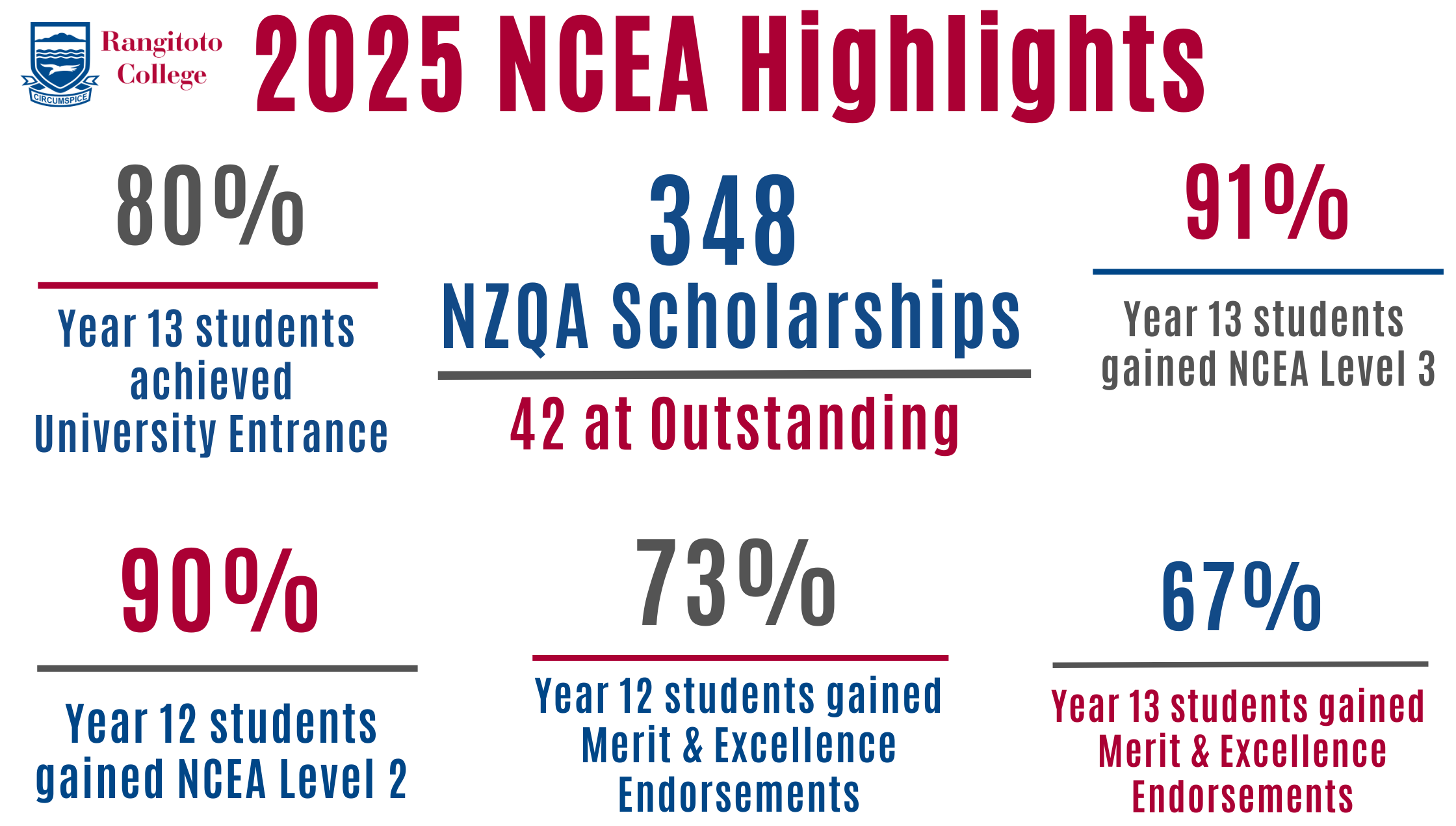 In 2025, our scholarship students achieved an outstanding 348 NZQA Scholarships, including 42 attained at the Outstanding level—a NZQA record for Rangitoto College, representing the highest tier of scholastic achievement in the country.