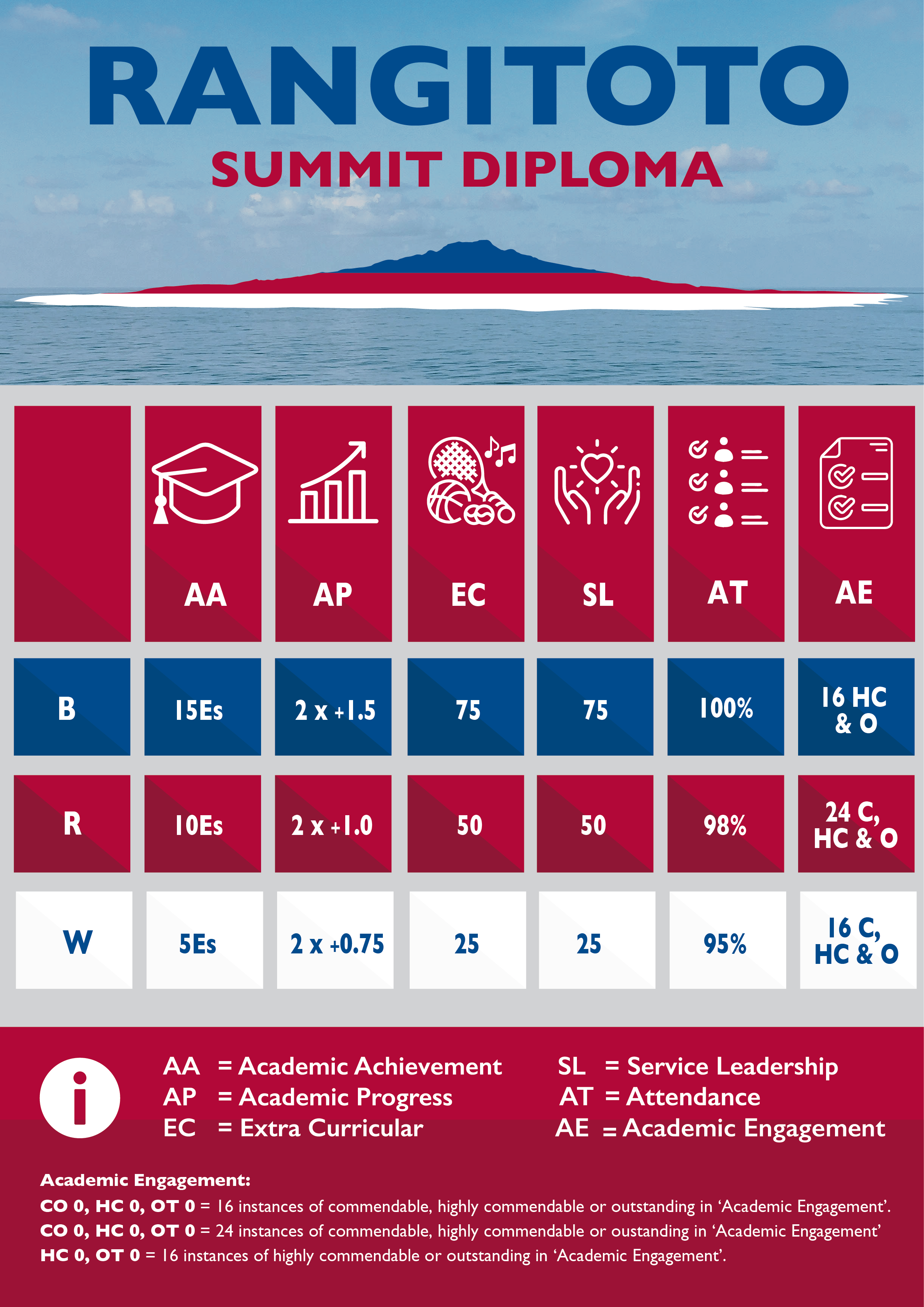 See the infographic below for a visual summary of the Rangitoto Summit Diploma.